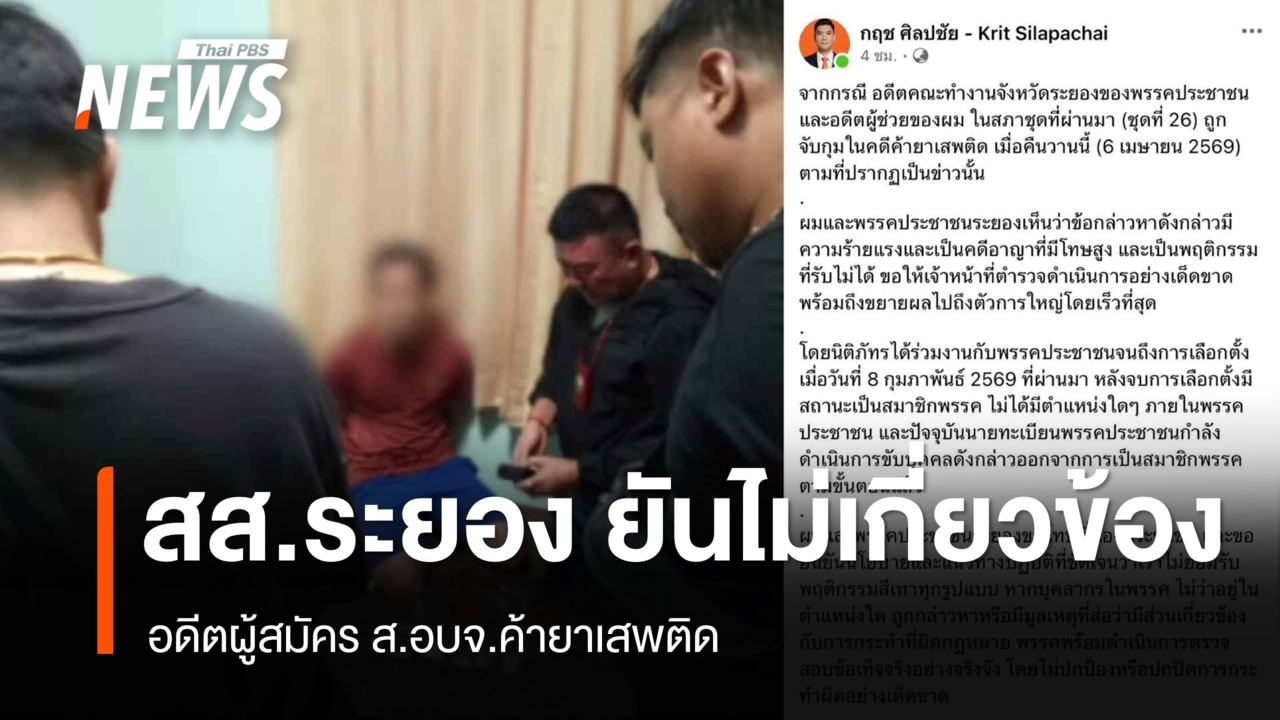 ขณะที่ นายกฤช ศิลปชัย สส.ระยอง เขต 2 พรรคประชาชน โพสต์เฟซบุ๊ก กฤช ศิลปชัย - Krit Silapachai ระบุข้อความว่า จากกรณีอดีตคณะทำงานจังหวัดระยองของพรรคประชาชนและอดีตผู้ช่วยของผม ในสภาชุดที่ผ่านมา (ชุดที่ 26) ถูกจับกุมในคดีค้ายาเสพติด เมื่อคืนวานนี้ (6 เม.ย.2569) ตามที่ปรากฏเป็นข่าวนั้น