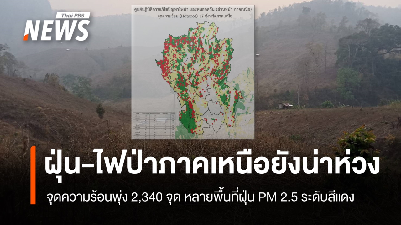 รายงานข้อมูลดาวเทียมเช้าวันที่ 9 เม.ย.2569 พบจุดความร้อนใน 17 จังหวัดภาคเหนือรวม 2,340 จุด ส่วนใหญ่อยู่ในพื้นที่ป่าอนุรักษ์ ขณะที่หลายพื้นที่ยังเผชิญค่าฝุ่น PM2.5 เกินมาตรฐานระดับสีแดง มากสุด อ.ปาย จ.แม่ฮ่องสอน 223.6 มคก./ลบ.ม.