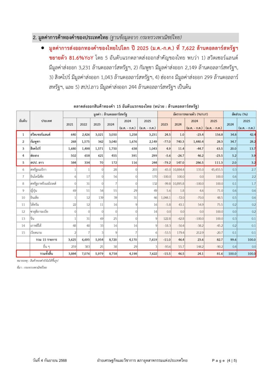 นายเกรียงไกร เธียรนุกุล ประธานสภาอุตสาหกรรมแห่งประเทศไทย (ส.อ.ท.) เปิดเผยว่า ที่ประชุมคณะกรรมการร่วมภาคเอกชน 3 สถาบัน ประกอบด้วย ส.อ.ท. สภาหอการค้าแห่งประเทศไทยและหอการค้าไทย และสมาคมธนาคารไทย ได้ตั้งข้อสังเกตสาเหตุค่าเงินบาทแข็งค่าเร็ว และรุนแรง เนื่องจากสาเหตุส่วนหนึ่งมาจากความผิดปกติบางอย่างในเรื่องของการส่งออกทองคำ โดยเฉพาะการส่งออกไปกัมพูชา ล่าสุดเดือน ม.ค.-ก.ค. 68 ไทยส่งออกทองคำไปกัมพูชา เป็นอันดับ 2 รองจากสวิตเซอร์แลนด์ มูลค่ากว่า 2,149 ล้านดอลลาร์สหรัฐ ประมาณ 68,000 ล้านบาท เพิ่มขึ้น 28.3% คิดเป็นสัดส่วน 28.2% เทียบกับการส่งออกทองคำทั้งหมด ถือเป็นอัตราที่สูงมาก ทั้งที่กัมพูชา เป็นประเทศเล็กๆ เป็นประเด็นเร่งด่วนที่ต้องนำไปหารือกับรัฐบาลใหม่ต่อไป