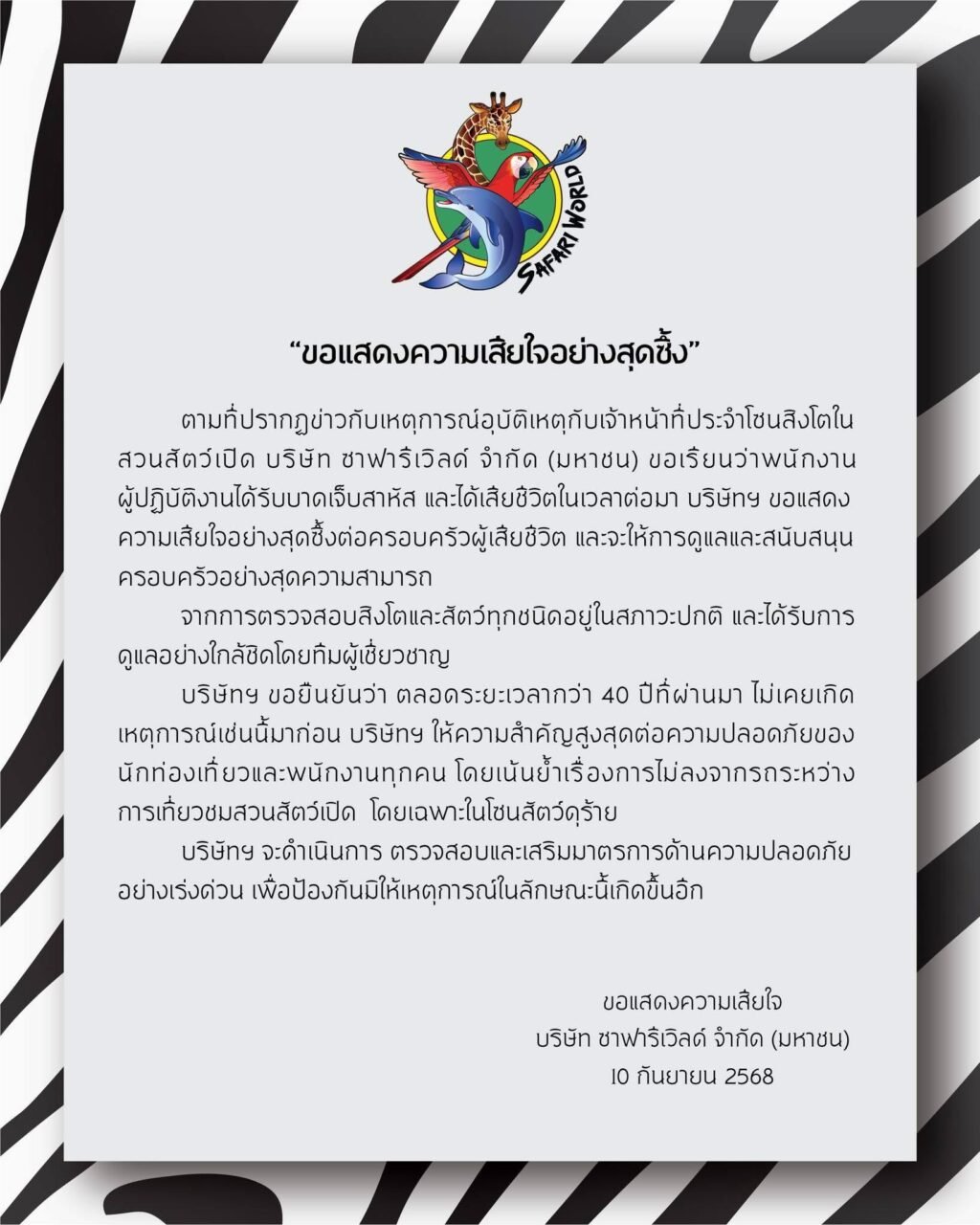 บริษัทฯ ขอยืนยันว่า ตลอดระยะเวลากว่า 40 ปีที่ผ่านมา ไม่เคยเกิดเหตุการณ์เช่นนี้มาก่อน บริษัทฯ ให้ความสำคัญสูงสุดต่อความปลอดภัยของนักท่องเที่ยวและพนักงานทุกคน โดยเน้นย้ำเรื่องการไม่ลงจากรถระหว่างการเที่ยวชมสวนสัตว์เปิด โดยเฉพาะในโซนสัตว์ดุร้าย บริษัทฯ จะดำเนินการ ตรวจสอบและเสริมมาตรการด้านความปลอดภัยอย่างเร่งด่วน เพื่อป้องกันมิให้เหตุการณ์ในลักษณะนี้เกิดขึ้นอีก