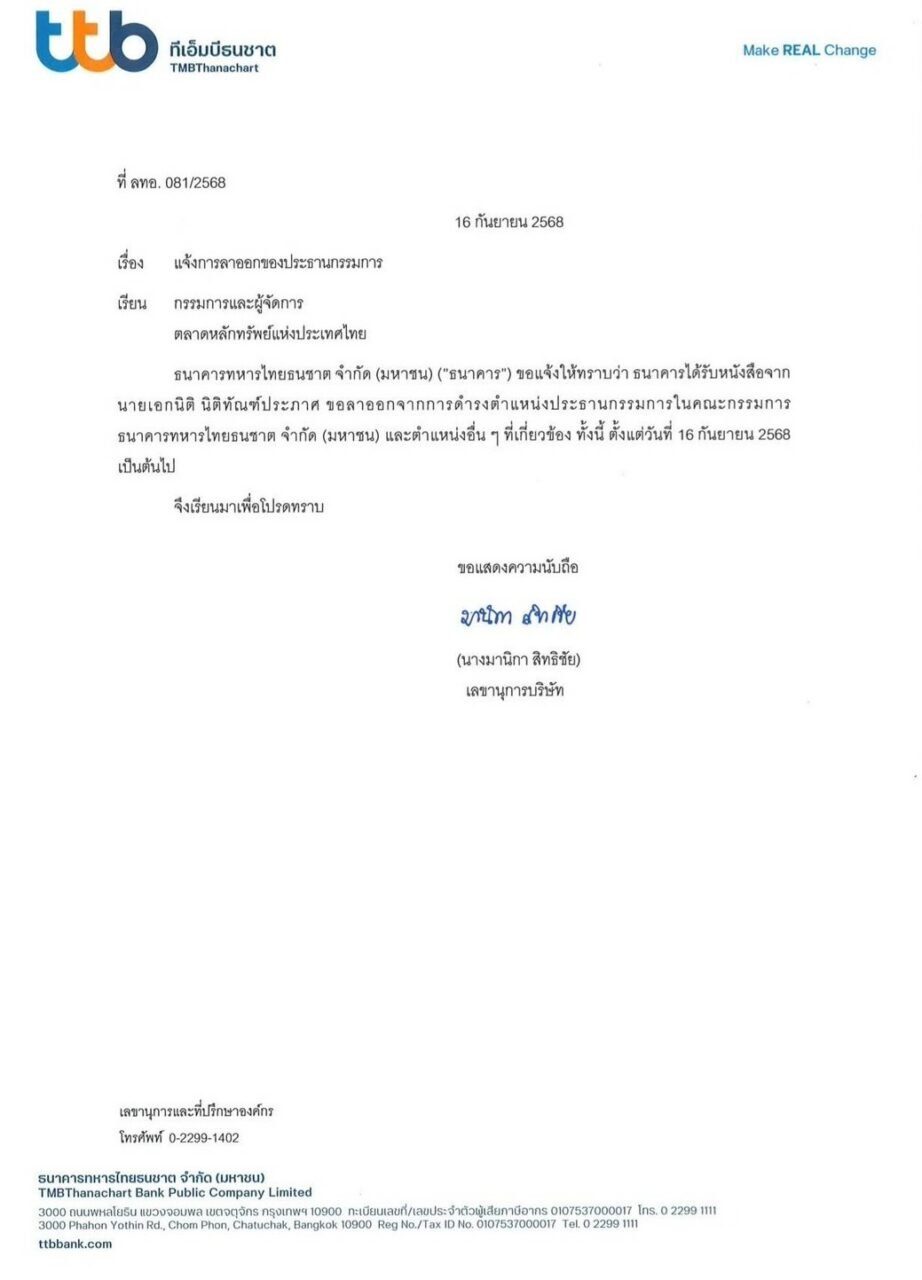 ธนาคารทหารไทยธนชาต ส่งหนังสือถึงตลาดหลักทรัพย์แห่งประเทศไทย แจ้งเรื่องการลาออกของประธานกรรมการ โดยแจ้งให้ทราบว่า ธนาคารได้รับหนังสือจากนายเอกนิติ ขอลาออกจากตำแหน่งประธานกรรมการธนาคารทหารไทยธนชาต และตำแหน่งอื่นๆ ที่เกี่ยวข้อง ทั้งนี้ ตั้งแต่วันที่ 16 กันยายน 2568 เป็นต้นไป