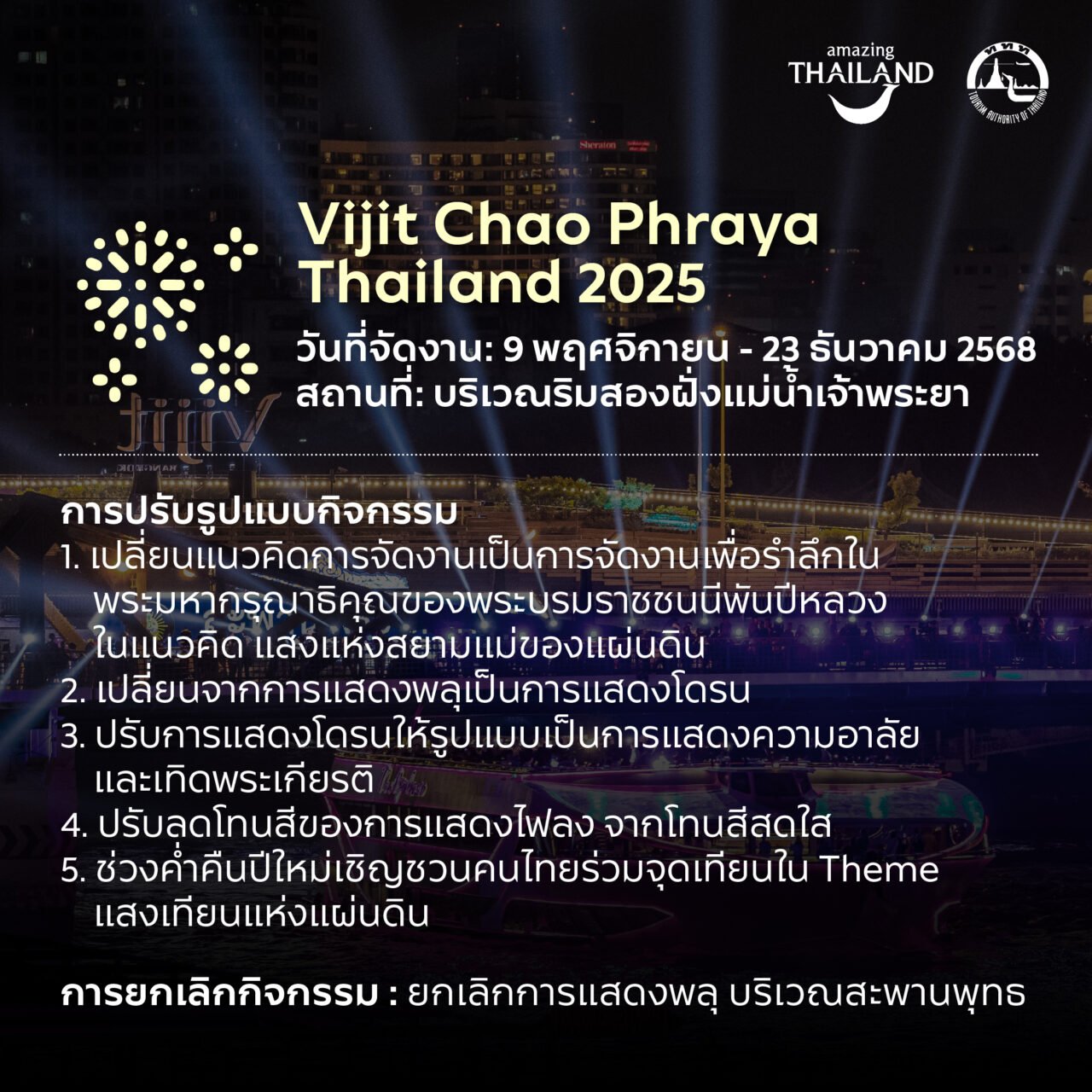 โดยพิจารณาปรับกำหนดการจัดงาน VIJIT CHAOPRAYA THAILAND 2025 เป็นวันที่ 9 พฤศจิกายน – 23 ธันวาคม 2568 และปรับรูปแบบการจัดกิจกรรม รวมถึงปรับรูปแบบการจัดกิจกรรมสำคัญ ได้แก่ Maha Loy Krathong @ Ayutthaya,Maha Loy Krathong @ Sukhothai,Amazing Thailand Marathon Bangkok 2025 โดยคำนึงถึงความเหมาะสม สำรวม และแสดงถึงความเคารพอย่างสูงสุด