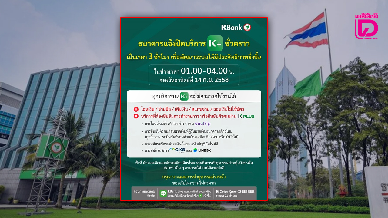 ธนาคารกสิกรไทย แจ้งปิดแอป K PLUS ชั่วคราว เป็นเวลา 3 ชั่วโมง ช่วง 01.00-04.00 น. ของวันที่ 14 ก.ย. 68
